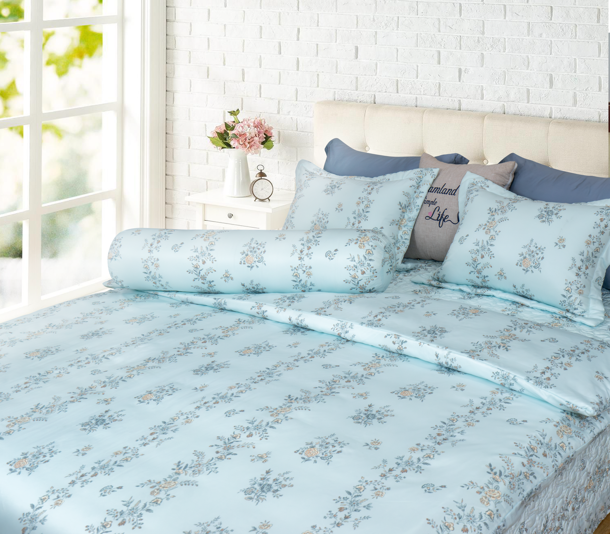 Tông xanh pastel và họa tiết hoa nhí nhẹ nhàng mang đến cảm giác trong trẻo, tươi mát cho căn phòng ngủ. Mỗi chi tiết được chăm chút tinh tế, gợi nên nét đẹp hiện đại xen lẫn chút thơ mộng. Đây là lựa chọn lý tưởng cho những ai yêu thích nét đẹp nhẹ nhàng, thơ mộng.